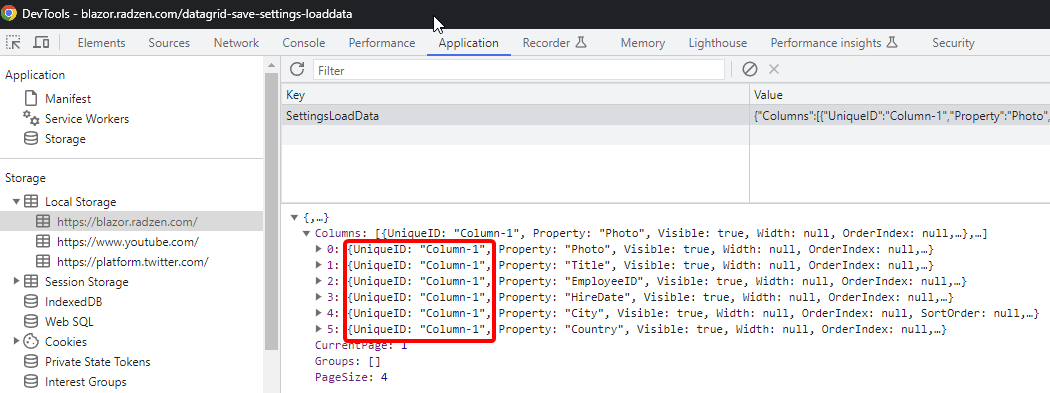 Run demo Blazor DataGrid save/load settings with 2+ columns without Property Broken. After save setting and load, browser freezes, only clearing the cache helps (delete settings)