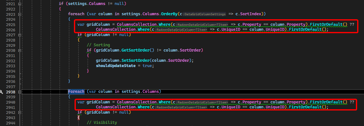 I tried using only ColumnsCollection.Where(c => c.UniqueID == column.UniqueID).FirstOrDefault()