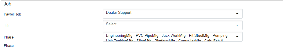 When the dropdown "payroll job" has a value selected the items in the "phase" dropdown are updated(changed). In the picture on the left payroll job is Unapplied Labour while the phase dropdown contains labour and materials as options to select. The picture on the right shows that the payroll job has been changed to Dealer Support. The HTML select has its values changed/updated where the radzen dropdown does not change/update. I know template doesn't apply in this case but I just wanted to show that the list does in fact update when it is used. How do I get this to work without using template?