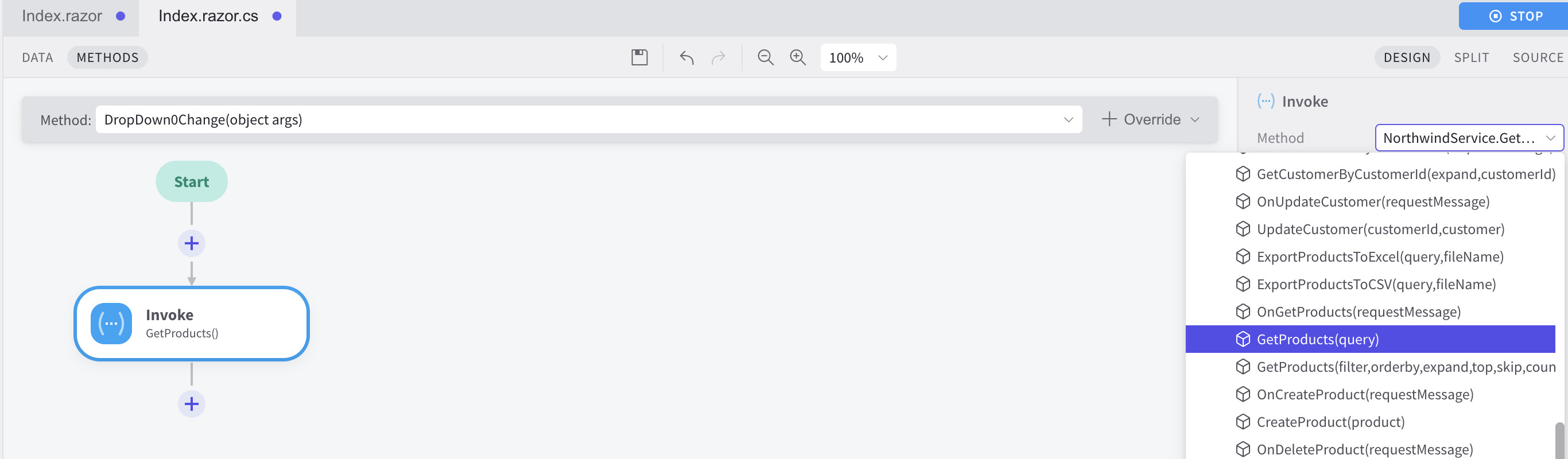 Add a new Invoke statement in the method builder. Set method to GetProducts()