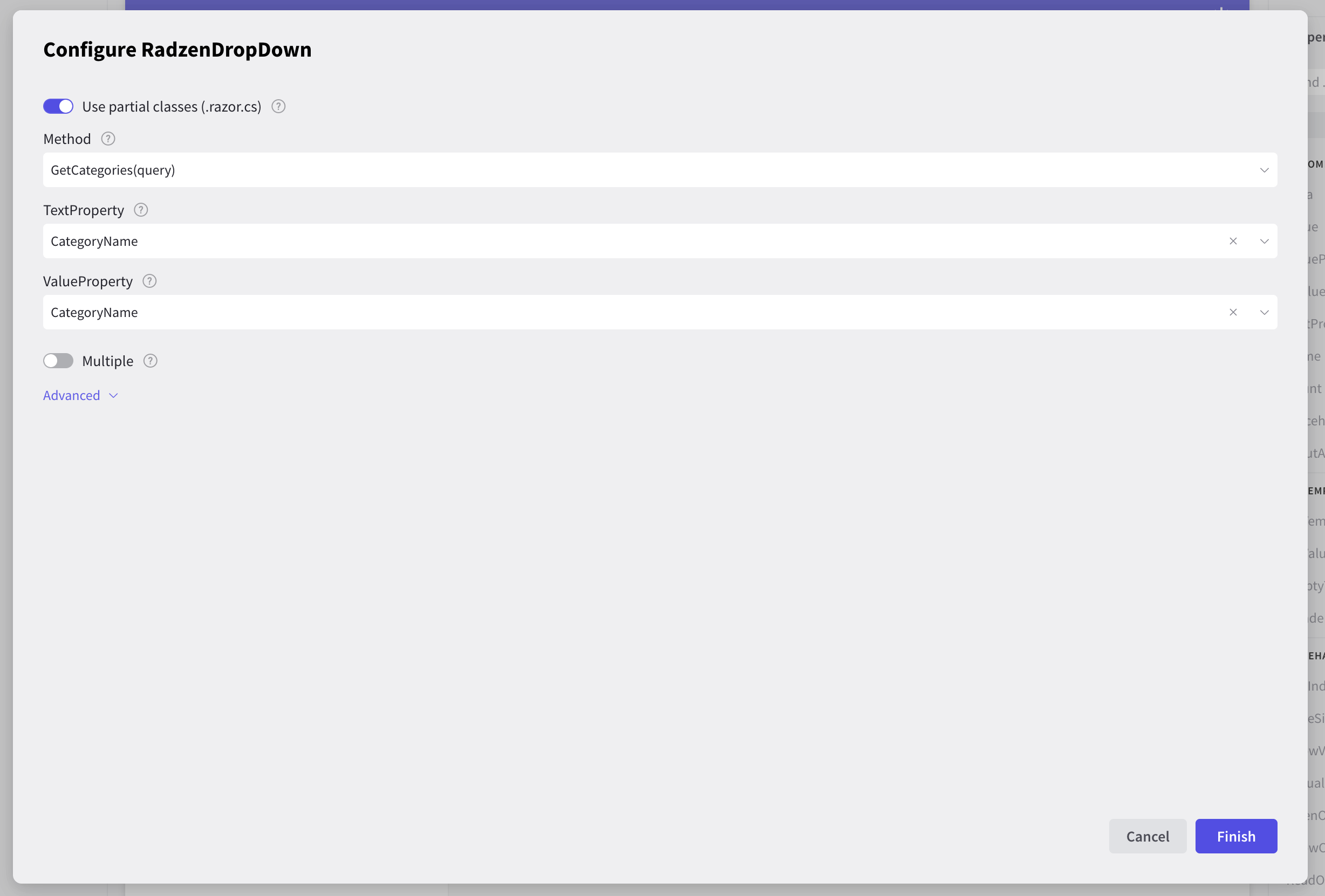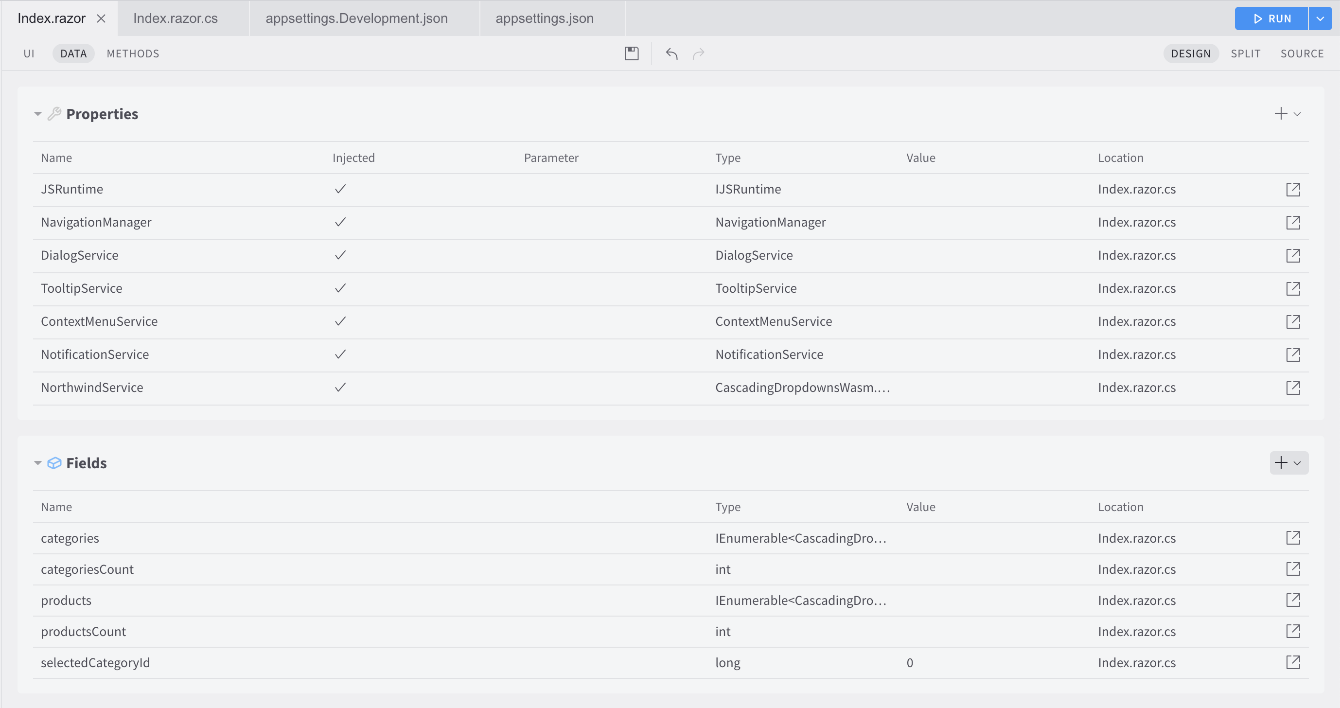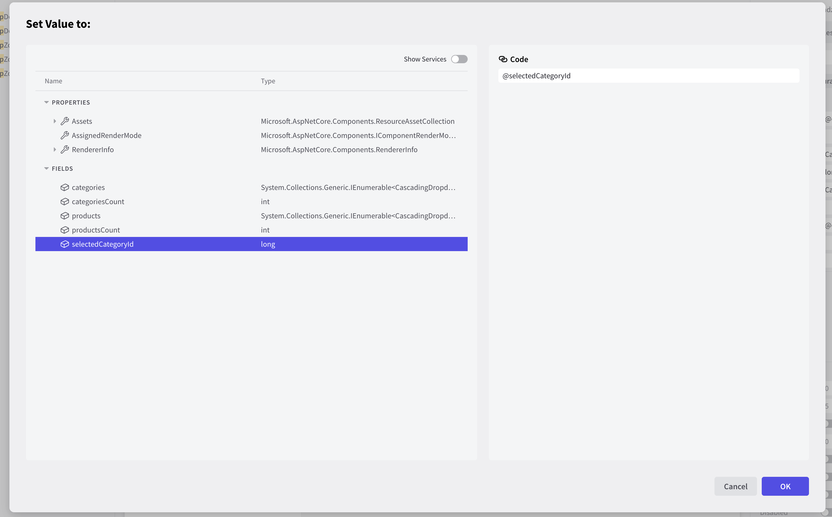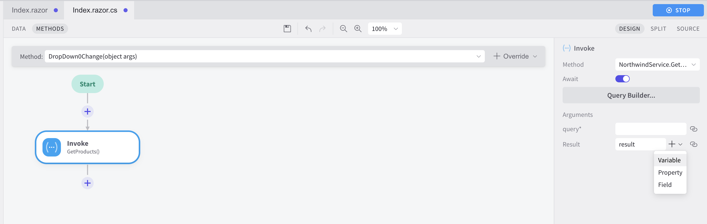 Finally add a new Assignment statement and set products to result.Value. This will assign the Value property of the result returned by the GetProducts() method to the products collection which is what the dropdown displays. This is specific to WASM applications and for Blazor server applications the assignment should be just products to result.