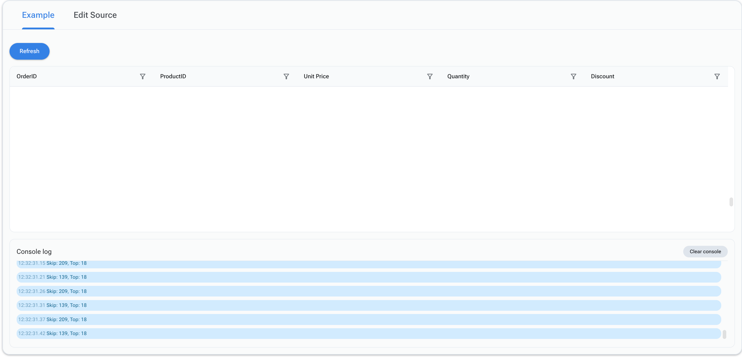 When CSS zoom is applied to the DataGrid or any parent container between the html element and the grid and data virtualization is enabled, scrolling triggers an infinite loading loop. The component miscalculates which records should be loaded, causing continuous data requests every few milliseconds and visual flickering.