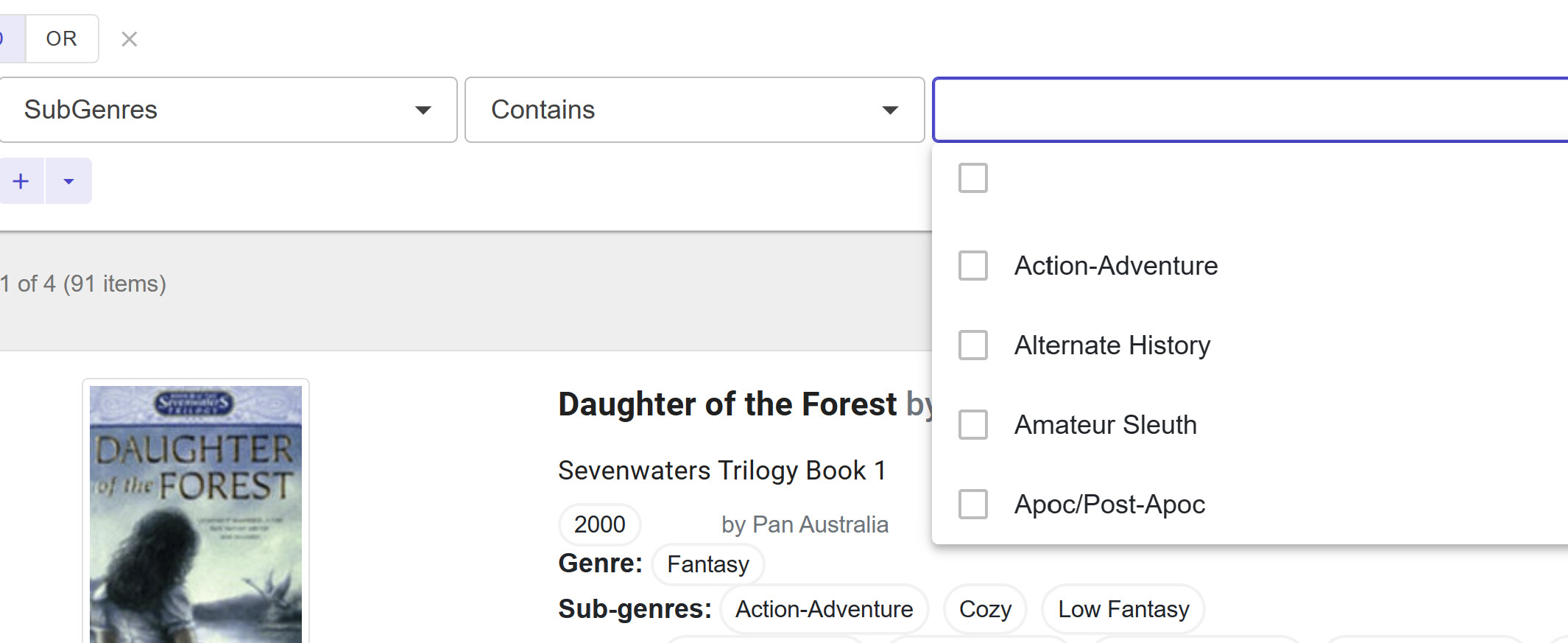 I see the dropdown getting populated, but clicking a box doesn't filter the data set. For example in the screenshot below, if I clicked 'Action-Adventure', it should filter and show me at least the first object in the data list that has Action-Adventure listed as one of the subgenres. What am I missing to implement this?