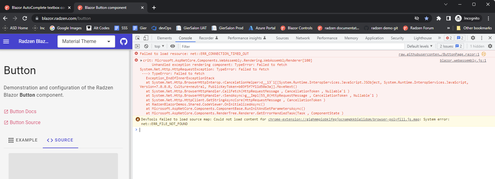 The demo for blazor component is not working properly. Many time it crashes saying error. (which I can't see). Also the "Source" tab doesn't work. Is it a known issue?