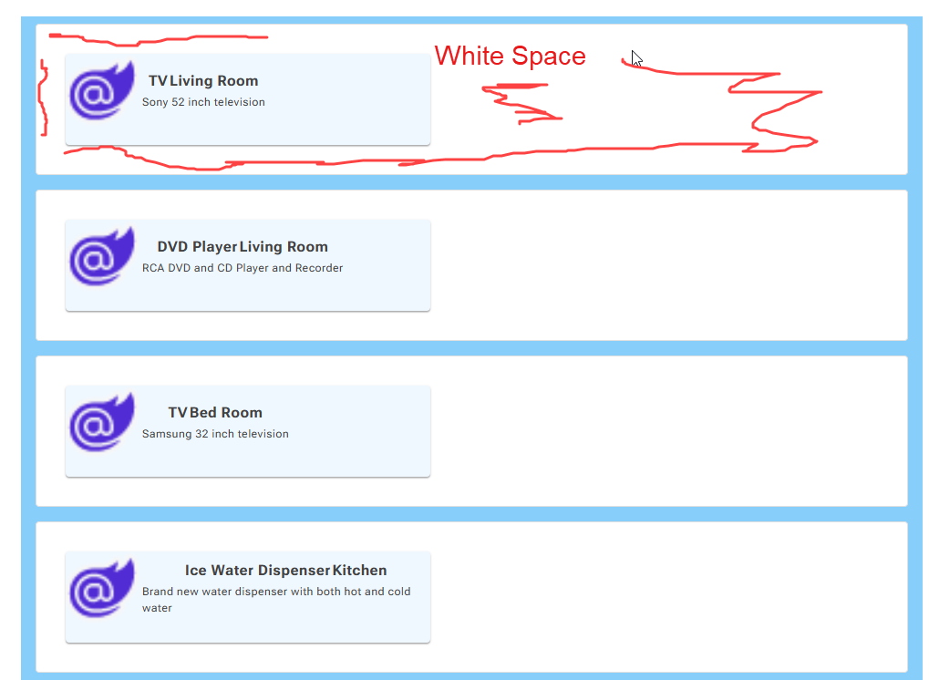 Hello. I’ve just started using Radzen in a Blazor web app. I’m using Visual Studio 2022. I’m trying to create a page that has a list of inventory items using DataList and Card. I’ve got it working but each card has a lot of white space around it, almost like it is within another card. Most likely it is user error, but I’ve spent a lot of time on it and can’t figure it out. I would like to remove that white space so that the cards are next to each other with a small gap. Attached is screen sample and the code. Thanks.