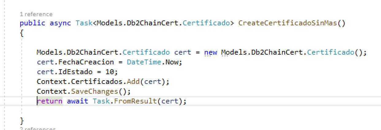 You need to write "return await Db2ChainCert.CreateCertificadoSinMas()" inside "Code" at the first image.