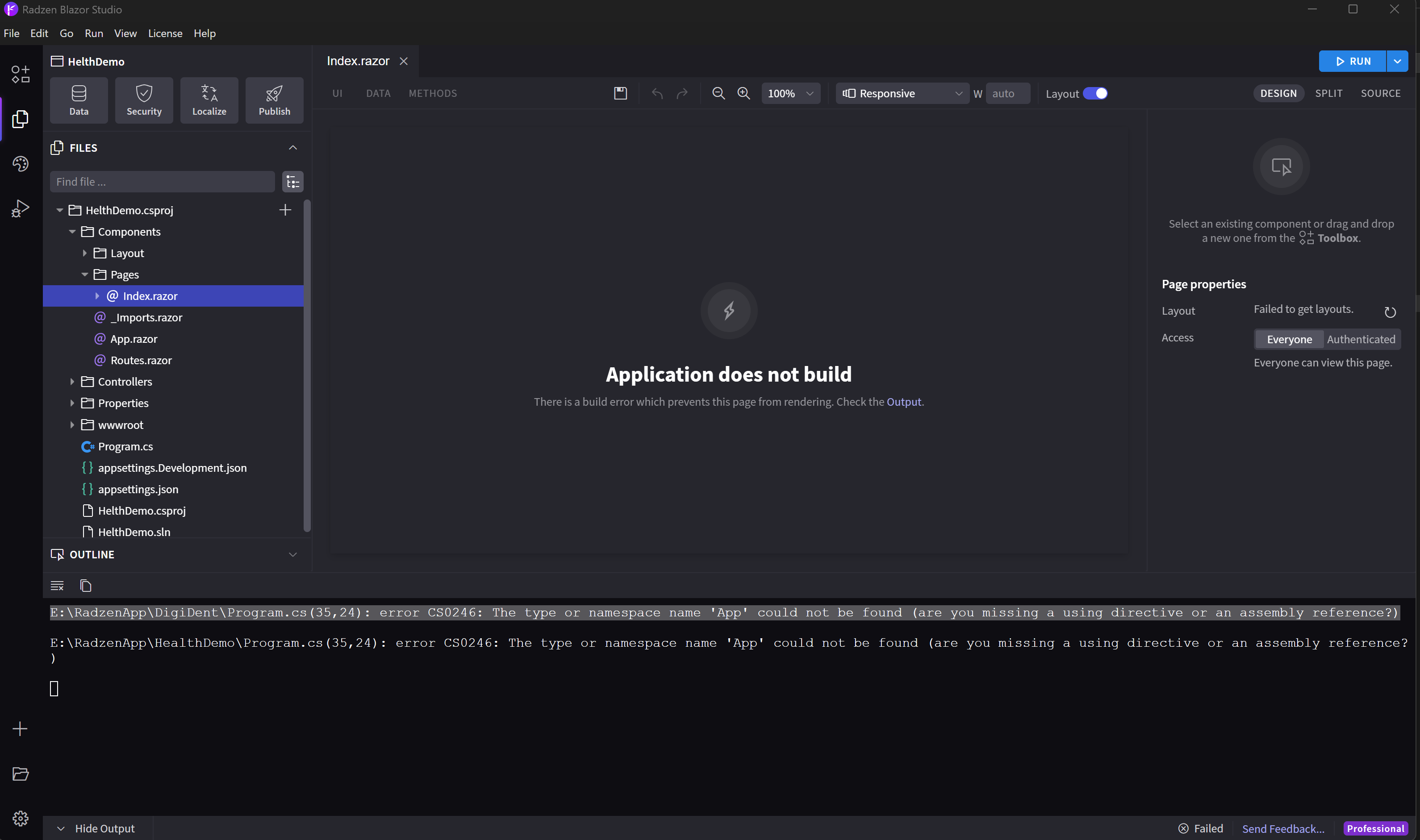 My application is too big and I do not want to share it. Just to stress it is fully functional when it is compiled but I tried to edit some components from standalone Radzen Blazor Studio and received this error:
