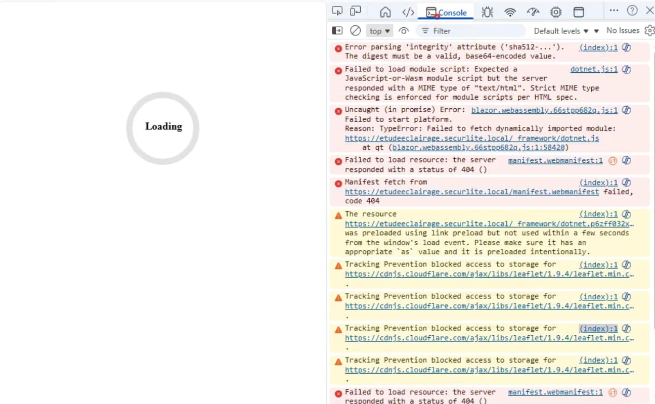 Check the network tab of your browser. I see errors for wrong MIME types being served - either your server returns incorrect MIME type or doesn't return the requested files but some generic error page.