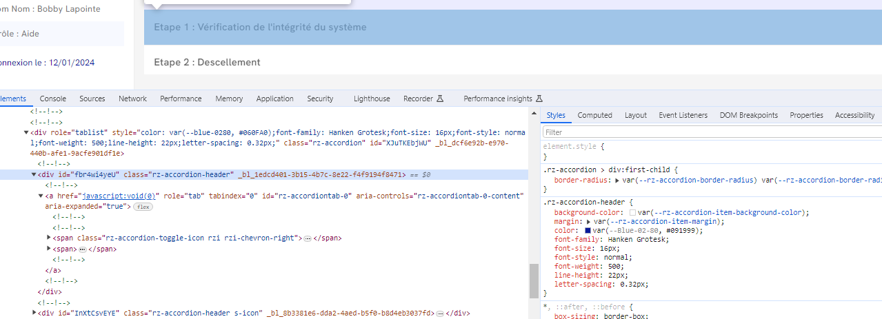 I'm trying to apply the style that i added in '.rz-accordion-header' to the text of accordion menu item.