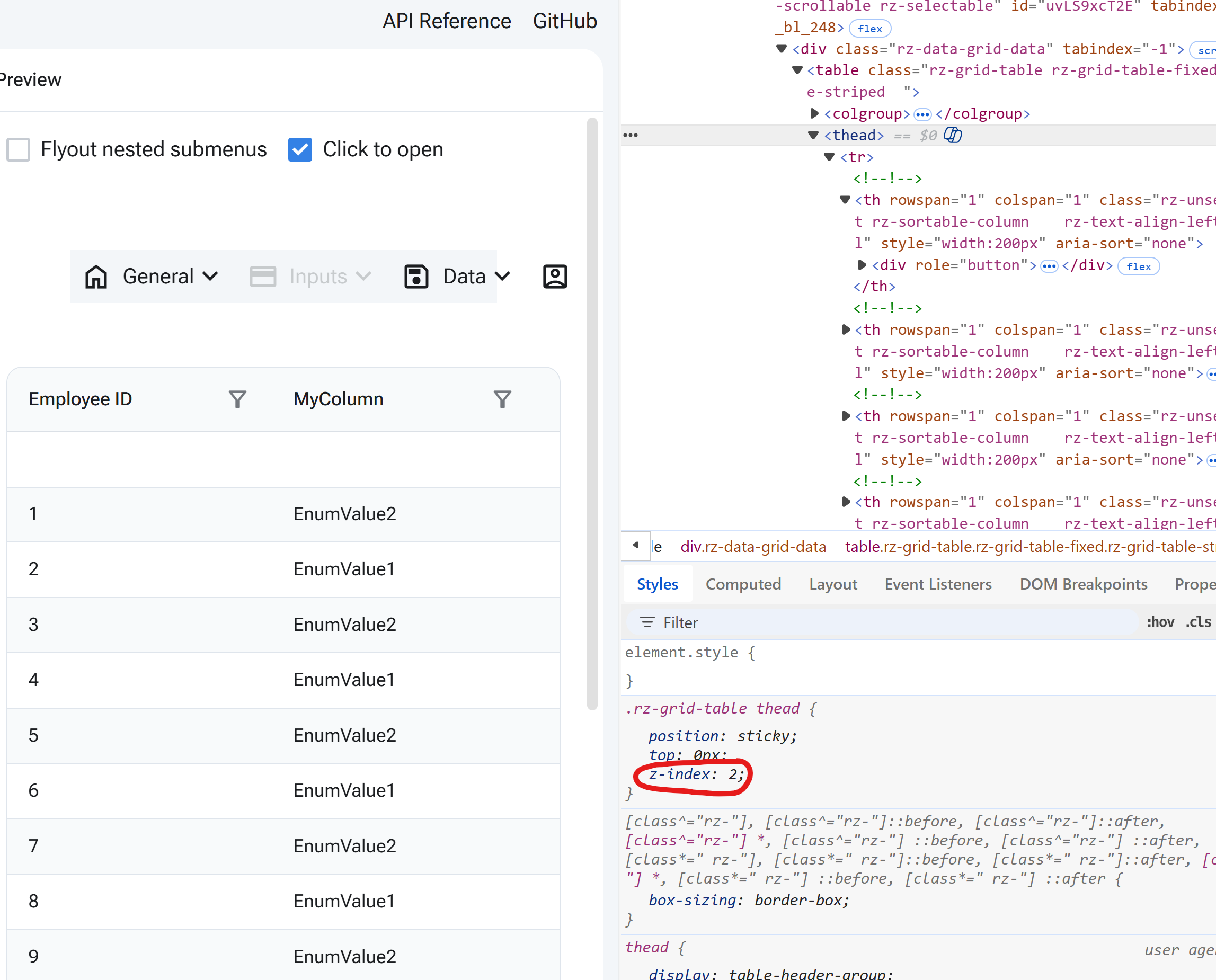 We have encountered a new issue in our app. It seems like the header for the RadzenDataGrid is now overlapping dropdown menus. Here is a picture of it interfering with the dropdown on a RadzenMenuItem: