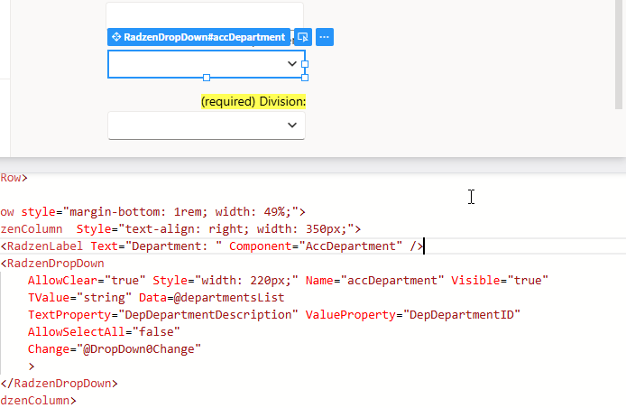 Hi! Using Radzen Blazor 1.56.2, with application set to use .NET 9 (but I have .NET 10 installed), I’ve ran into a bizarre problem: I have set up two dropdowns, where the second (Division) will appear once the first (Department) is populated. The Division does appear appropriately, but the selected Department value does not appear in it.