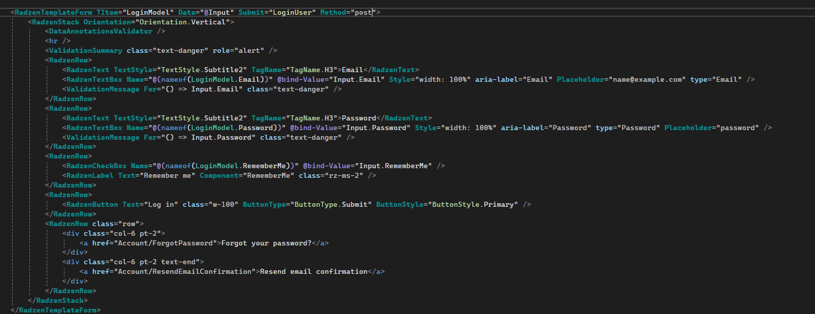 <RadzenTemplateForm TItem="LoginModel" Data="@Input" Submit="LoginUser">